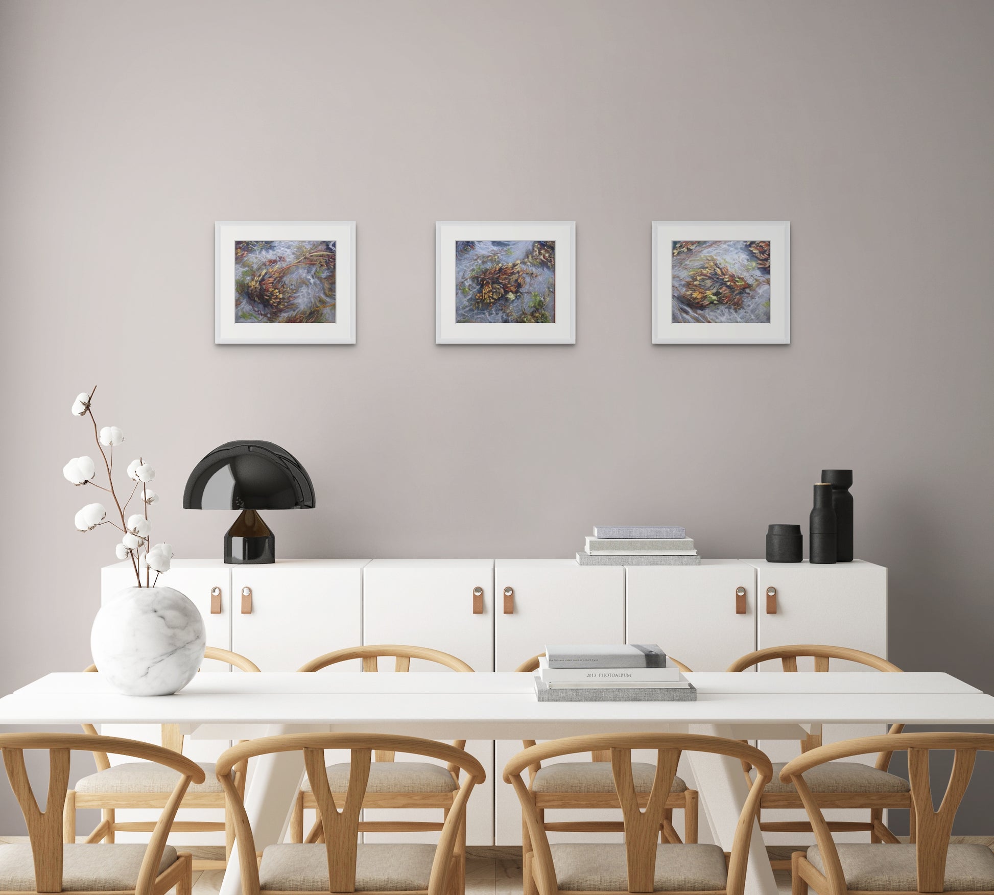 A series of 3 paintings, exploring water movement and light. The three paintings are of the same small section of seaweeds taken only seconds between each shot. Movement and light in the sea are wonderful - nothing ever stays the same - consistently changing.